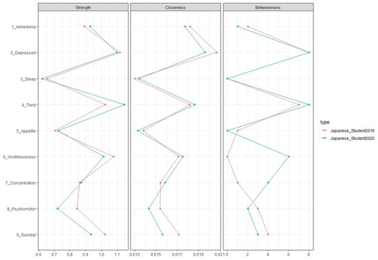 The PHQ-9 centrality scores between international students for each year. Legend: The changes in the importance of each item were visualized using network analysis. The red lines represent 2019, and the blue lines represent 2020. The higher the numerical value in the three centrality measures (moving towards the right), the greater the importance.
