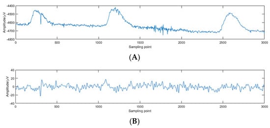 There is growing evidence for the role of the cerebral cortex in human postural control [24,25]. Several studies have used EEG to detect cerebral cortical activity during large-scale human balance control. In the EEG collection process, noise cannot be completely avoided, necessitating data preprocessing. In this paper, the EEGLAB v14.1.2 toolbox, which is matched with the Neuracle EEG collection instrument, was selected to preprocess the raw EEG signals. The preprocessing involved the positioning of 19 channels, the application of a 50 Hz power frequency notch filter to eliminate mains interference, followed by the 1–50 Hz FIR bandpass filter, as well as baseline removal to prevent zero drift caused by the device itself and external factors [26,27]. Furthermore, independent component analysis was used to remove artifacts caused by eye or muscle movements [28]. The artifact reference source is https://www.bitbrain.com/blog/eeg-artifacts (accessed on 22 April 2024). As shown in Figure 2, taking a segment of the EEG signal of the subject’s Fp1 channel as an example, obvious differences can be seen before and after data preprocessing.