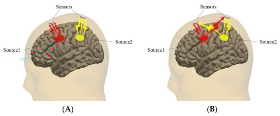 In the absence of external interference, the EEG collected by each electrode reflects the neural activity under the position of the electrode. However, in reality, the different characteristics of the physiological structures of the skull and scalp cause the conductivity of the brain to be nonuniform. The discharge behavior of the cerebral cortex is not only caught by the electrodes right above the cerebral cortex but also affects the signal collection by electrodes in surrounding areas [38,39]. The volume conduction effect refers to the high degree of correlation between electrode signals from the same source, resulting in time series misalignment and amplitude interference. Under ideal conditions, each electrode measurement is shown in Figure 3A. In practice, the signals measured by the electrodes may be affected by homologous signals, which is the result of concurrent mixing of the activities of multiple brain regions. The process is shown in Figure 3B.