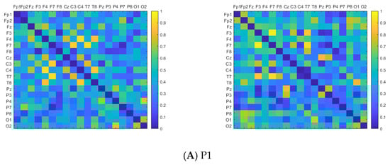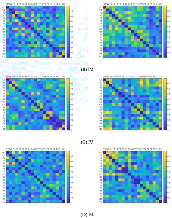 To compare the EEG sequences before and after PLV screening, this study utilized the original dataset comprising numerous resting-state EEG recordings, as well as the screened dataset. Subsequently, PLV adjacency matrices were calculated from these datasets. This paper segmented the EEG sequences through sliding time windows and calculated the PLV among 19 channels in each time window. The PLV adjacency matrices related to each balance task of the subjects were obtained by averaging the set of adjacency matrices obtained. The horizontal and vertical coordinates of the adjacency matrix represent the 19 EEG channels, with the matrix elements denoting the PLV between the corresponding two channels. It is observed that the synchronicity among channels of the EEG sequences after PLV screening is more prominent, as shown in Figure 4.