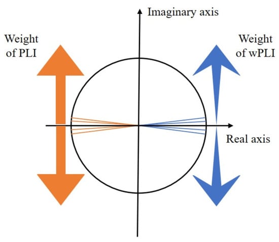 The idea of phase lag synchronization is to allow the loss of partial uncertain connectivity to prevent the impact of the volume conduction effect. In terms of noise sensitivity, the relationship between the wPLI and the PLI lies in the fact that the wPLI algorithm assigns different weights to the sign function . The weight setting of the wPLI makes the imaginary part of the cross-spectrum around the real axis contribute less than the imaginary part of the cross-spectrum around the imaginary axis, decreasing sensitivity to noise [43]. As shown in Figure 6, the thickness of the arrows in the figure denotes the distribution of weighting of the two methods to the phase difference.