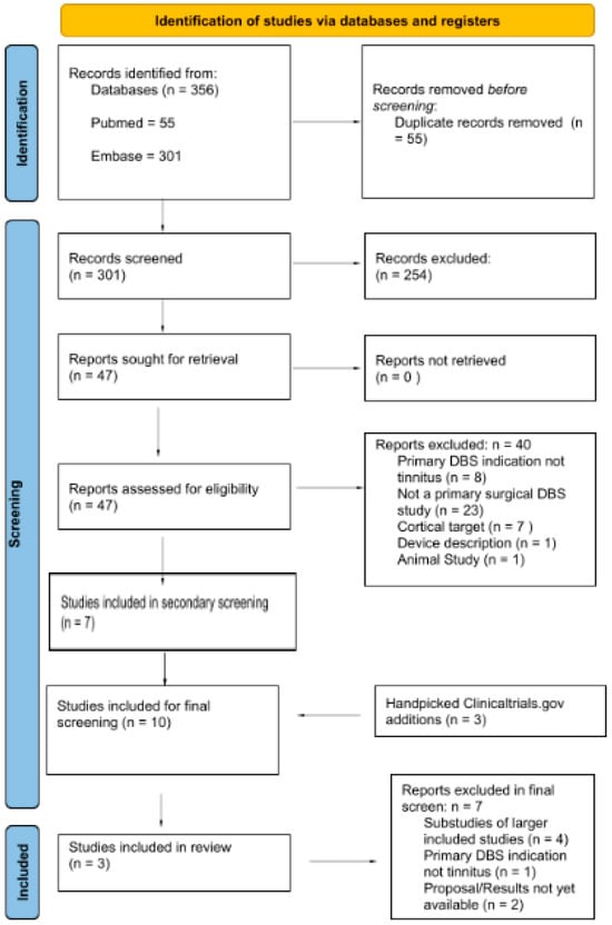 The search in PubMed yielded 55 articles, and the search in EMBASE yielded an additional 301 articles. There were 55 duplicate articles. There were a total of 47 articles that looked at human invasive neuromodulation with a treatment effect of tinnitus symptom change; of these, seven were non-cortical targeted and for the primary indication of tinnitus treatment. A search on clinicaltrials.gov revealed an additional three studies that were included in the analysis for a total of 10 articles. Of the ten remaining articles, the primary author (LB) performed a full text review and seven of the studies failing to meet inclusion and/or exclusion criteria were removed from final analysis. After this systematic approach, the final three studies were used for data extraction for cases for the final review (Figure 1). For these studies we identified the target for DBS, outcome measures of interest, device used, and complications. We pooled these cases into a table (Table 1) but due to the small numbers we were unable to perform a formal meta-analysis.