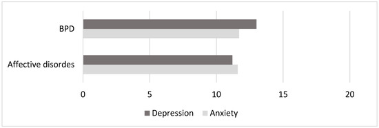 A comparative analysis of the average values of the level of anxiety and depression showed that anxiety in both affective disorders (m = 11.7 ± 2.7) and emotionally unstable personality disorder of the borderline type (m = 11.6 ± 3.3) was nearly within the same range, but the level of depression was slightly higher in BPD (m = 13 ± 4.3) (Figure 1). This result can be explained not by the severity of the disorder itself but by the higher emotional sensitivity of the patients with BPD, demonstrating traits in the personality structure, preoccupation with their experiences and a tendency to exaggerate them.
