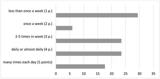 Based on the results of the suicidal ideas intensity analysis, 35.3% of the subjects were revealed to have suicidal thoughts many times every day or almost every day (m = 4.3 ± 0.5), 29.4% of respondents noted such thoughts up to 2–5 times per week (m = 3 ± 0.1), while the remaining patients thought about suicide once per week or less (Figure 2).