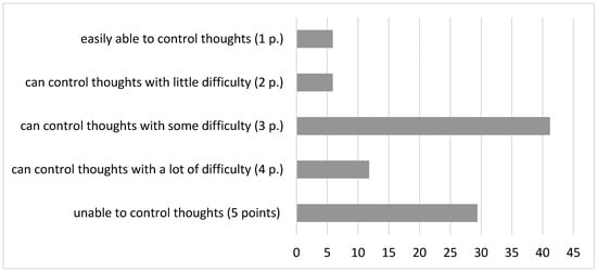 Almost half of respondents (47%) note that the duration of these thoughts is 1–8 h (long/most of the day), while 41% of patients are unable to control these thoughts or do it with great difficulty, the rest can exercise control with some minor difficulties (Figure 3).