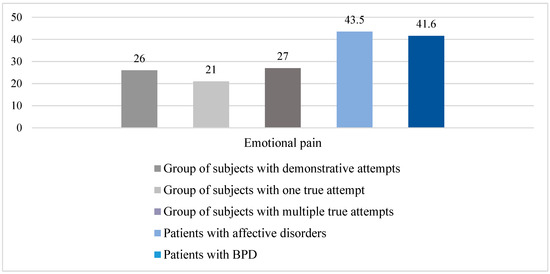 To assess the sensitivity threshold of mental pain, as well as determine its severity, the “Mental Pain” scale was used. A study of the level of mental pain in the compared subgroups of patients showed that both groups of patients have high scores on this scale (patients with affective disorders, m = 43.5 ± 10; patients with BPD, m = 41.6 ± 6.5, and for the maximum, 65), which reflects a fairly high level of experience.