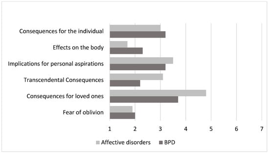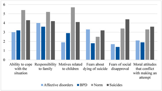 A significant difference was found in the motive “Fears about dying of suicide”: the average value in the subgroup of affective disorders is higher than in the subgroup of BPD (p < 0.05) but corresponds to the indicator of the suicides sampling. This difference is confirmed by the Mann–Whitney comparative analysis and is statistically significant.