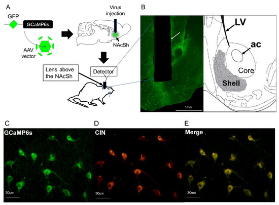 Localization of lens implantation site and the expression of GCAMP6s in CIN of NAcSh. (A) illustrates a schematic representation depicting the nucleus accumbens shell region (NAcSh) of ChAT-cre mice that were transfected with adeno-associated viruses (AAVs) containing cre-dependent GCaMP6s. This transfection resulted in the selective expression of GCaMP6s within the cholinergic interneurons (CIN) of NAcSh. (B) A representative photomicrograph displays a lesion (indicated by white arrow) resulting from the GRIN lens implantation within the nucleus accumbens shell (NAcSh), alongside neurons expressing green fluorescence attributed to the presence of GCaMP6s. Additionally, a coronal schematic (AP = 1.2), adapted from Figure 21 in [18], is included to provide further illustration of this precise localization. LV = lateral ventricles; ac = anterior commissure. (C–E) Representative photomicrograph showing green-fluorescent neurons (suggesting GCaMP6s expression; (C)) and red fluorescent neurons (suggesting ChAT expression in the CIN; (D)) and a merged image of (C,D) showing GCaMP6s expression in CIN (yellowish orange-fluorescent neurons; (E)).
