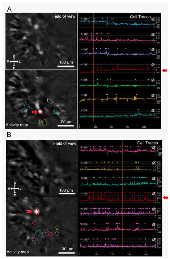 Video S1 (alcohol group) and Video S2 (sucrose group) show an example of an 18 min imaging session during alcohol or sucrose consumption on day 4. Figure 2 displays the representative field of view (location of each individual cell extracted from the recorded imaging videos), activity map, and cell traces with overlaid detected events (individual calcium dynamics assessed across the session) of sucrose (panel A) and alcohol (panel B) group.