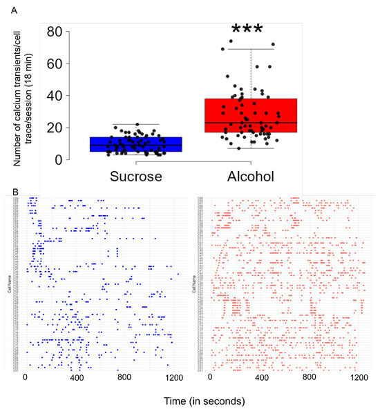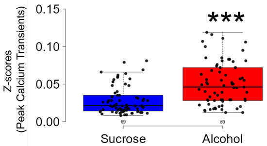 Once the calcium imaging data during all 4 h of alcohol/sucrose consumption was recorded and saved, it was subsequently exported as .csv (Excel Version 2402) and .MP4 (video) files for offline analysis. Because mice consume the majority of alcohol during the first half of the 4 h alcohol access, we analyzed the data for only the first hour of alcohol/sucrose consumption, forming only one specific time point for evaluation. Z-scores were computed for each cell trace to identify calcium transients exhibiting a bell-shaped curve with distinct peak values. A “Raster plot” was created to visualize the occurrence and timing of calcium transients during alcohol or sucrose exposure. In the raster plot, each line signifies an individual calcium transient, with the x-axis representing time and the y-axis indicating different transients or cells [20]. A box plot was used to visualize the variability and distribution of calcium transient peaks and numbers observed during the entire 18 min session for both alcohol-exposed and sucrose-exposed animal groups.