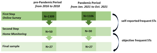 During the pre-pandemic period, 1309 subjects responded to the online survey. From this sample, n = 50 met the inclusion criteria of the first phase and were recruited for home monitoring. Similarly, of the 1106 questionnaires collected during the pandemic period, n = 30 subjects were eligible for home monitoring (Figure 1).