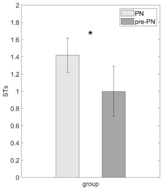 PN showed a significantly higher weekly ST frequency (mean [SE] PN = 0.17 [±0.7] pre-PN = −0.27 [±0.9]) than the pre-PN group (F = 6.156; p = 0.016) (Figure 2).