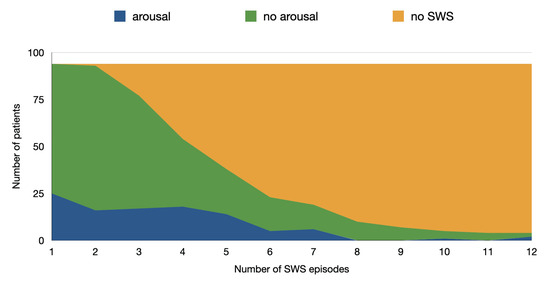 In a total of 431 SWS segments, 104 ended with movement. Figure 1 shows the distribution of the movement termination of SWS segments over the number of SWS segments found per patient. Because of the fragmented sleep, some patients had a high number of short SWS segments.