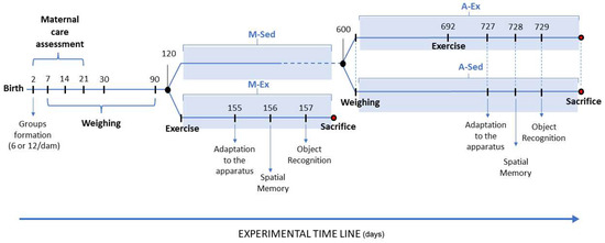 Timeline depicting the assessment of body weight and maternal care behaviors in pre- and post-weaned Wistar rats from small (6 pups/dam) and large litters (12/dam). M-Sed: mature adult rats leading a sedentary lifestyle; M-Ex: mature adult rats undergoing a regular exercise regimen; A-Sed: sedentary aged rats; A-Ex: aged rats undergoing a regular exercise regime.