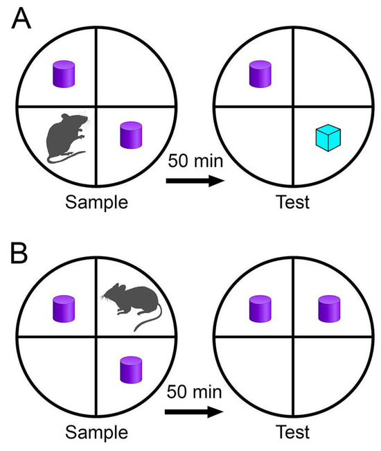 Schematic representation of the experimental setups for object recognition tests. (A). Object identity recognition: rats are anticipated to exhibit a preference for the “novel” object over the “familiar” one. Purple shapes represent the “familiar” object; blue shape represents the “novel” object. (B). Object placement recognition: rats are anticipated to display a preference for the “displaced” object over the “stationary” one. Adapted from [54].