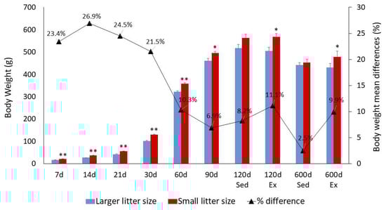 Changes in body weight over time. This figure displays the mean body weight (±standard error of the mean) of rats raised in litters of 6 (small litters) and 12 (large litters), measured at different ages and under various exercise conditions. Statistical significance is indicated by asterisks: (*) denotes significant differences detected by a two-tailed t-test, covering the period from the 7th to the 90th postnatal day (PND). For the measurement taken at the 600th PND, significant differences were determined using a three-way ANOVA. The significance levels are as follows: (*) represents p < 0.05; (**) represents p < 0.01. These results highlight how body weight varies in rats depending on litter size and exercise over time.