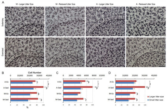 - Viana, L.C.; Lima, C.M.; Oliveira, M.A.; Borges, R.P.; Cardoso, T.T.; Almeida, I.N.F.; Diniz, D.G.; Bento-Torres, J.; Pereira, A.; Batista-de-Oliveira, M.; et al. Litter size, age-related memory impairments, and microglial changes in rat dentate gyrus: Stereological analysis and three dimensional morphometry. Neuroscience 2013, 238, 280–296. [Google Scholar] [CrossRef]
