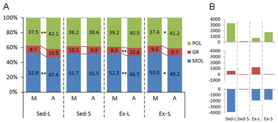 Regarding the dentate gyrus volumes, while mature exercised rats from smaller litters showcased higher values and aged sedentary rats from larger litters exhibited smaller volumes on average, no statistically significant differences were detected among the experimental groups. An exception was noted in the aged rats from smaller litters raised sedentarily, who displayed a significant reduction compared to age-matched exercised animals raised in similar-sized litters (F1,32 = 6.16; p < 0.018, three-way ANOVA, pairwise comparisons [Q = Tukey HSD: t(8) = 2.40, p < 0.0434]).