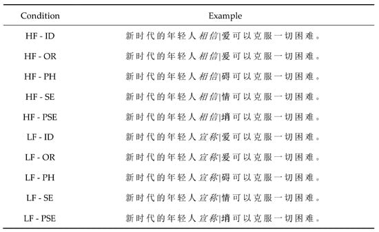 - Tsai, J.-L.; Lee, C.-Y.; Tzeng, O.J.L.; Hung, D.L.; Yen, N.-S. Use of Phonological Codes for Chinese Characters: Evidence from Processing of Parafoveal Preview When Reading Sentences. Brain Lang. 2004, 91, 235–244. [Google Scholar] [CrossRef] [PubMed]