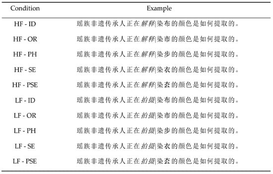 An example of sentence materials in Experiment 2. Note. HF = high frequency; LF = low frequency; ID = identical preview; OR = orthographically related preview PH = phonologically related preview, SE = semantically related preview, PSE = pseudo-character preview, unrelated to target word. The pretarget word (N) is presented in italics, while the previews of the target (N + 2) is in bold (for illustration purposes only). The vertical black line represents the position of the invisible boundary. As readers’ eyes crossed the boundary, the preview was replaced by the target. High and low refer to the foveal load condition. The sentence for HF condition means ‘The Yao ethnic heritage inheritor is explaining how the colors for dyeing cloth are extracted’. The sentence for LF condition means ‘The Yao ethnic heritage inheritor is filming how the colors for dyeing cloth are extracted’.