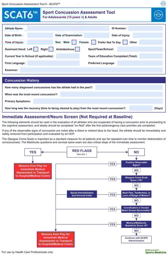 - Patricios, J.S.; Davis, G.A.; Ahmed, O.H.; Blauwet, C.; Schneider, G.M.; Purcell, L.K.; Echemendia, R.J.; Fremont, P.; Fuller, G.W.; Herring, S.A.; et al. Introducing the sport concussion office assessment tool 6 (SCOAT6). Br. J. Sports Med. 2023, 57, 648–650. [Google Scholar] [CrossRef] [PubMed]
