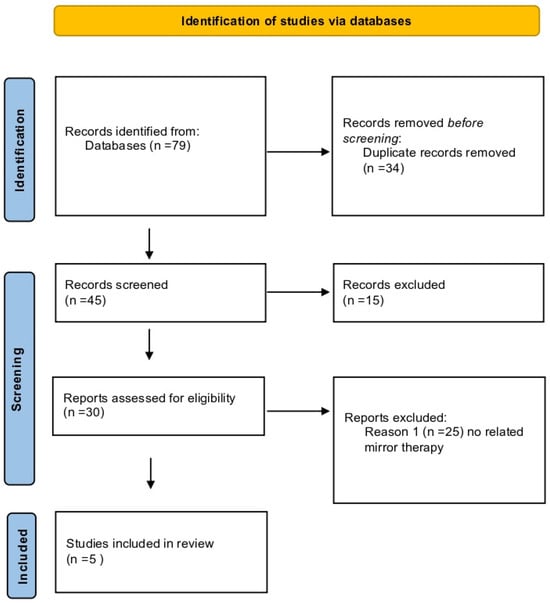 The literature research was performed on PubMed (via MEDLINE), Scopus (via EBSCO), PEDro, and Cochrane databases and Web Of Science using the following keywords: ((“peripheral facial nerve palsy”) OR (“Bell’s palsy”) AND (“mirror therapy”)); the final time of revision is 31 December 2023.