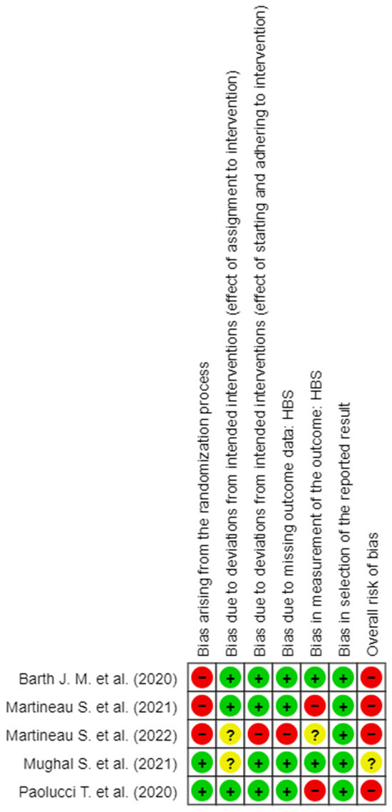It is important to underline that all authors reported HBS as an outcome. Although it is reported in all the studies included in the review, it was not possible to carry out the meta-analysis as different follow-ups and different types of analyzes are reported. according to the instrument used, all outcomes obtained a high-risk value.