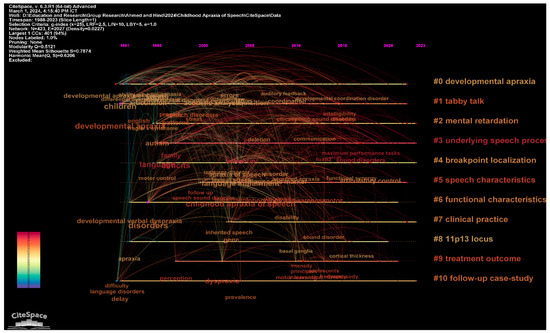 The major clusters identified in the study of childhood apraxia of speech (CAS) provide a comprehensive mapping of the landscape of research and practice in this domain. Cluster #0, the largest, focuses on “Developmental Apraxia” and underscores the complex nature of speech disorders linked to developmental issues. With a focus on a broad range of studies, including the impact of fragile X syndrome, this cluster highlights the intricate link between genetic factors and speech disorders. Similarly, Cluster #1, labelled “Tabby Talk”, encompasses a significant number of studies on technological interventions, such as augmentative and alternative communication (AAC) tools, demonstrating the growing trend towards incorporating technology in therapeutic strategies. These clusters signify a shift towards integrating diverse and multifaceted approaches in diagnosing and treating CAS, reflecting both traditional and innovative methodologies.