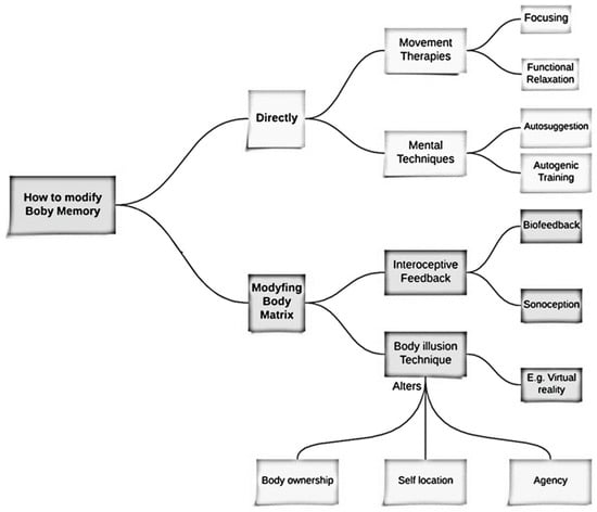 Movement therapies can help treat trauma by allowing individuals to re-enact painful experiences to face them and gain a new perspective on life [84,89]. BM also plays a role in treating dementia [90], where implicit memory remains intact while explicit memory is lost. Embodied therapies, which work on stored bodily memories, can promote resilience, positive emotions, and contentment. Two approaches to this way are “interoceptive exposure therapy” and training people to become more sensitive to different interoceptive sensations [91]. Also, mental techniques can control and modify bodily perceptions. For instance, autosuggestion and autogenic training can modulate tactile and painful bodily experiences, such as somatic symptoms, by allowing individuals to overwrite erroneous perceptions through the reiteration of an idea, e.g., “my arm is warm” instead of the physiological state “my arm hurts” [92].