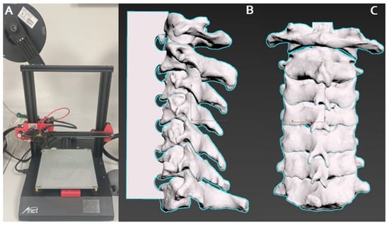 Cervical spine 3D model creation with FFF 3D printer (Anet A8®, Anet Technology Co., Shenzhen, China): (A) high-resolution cervical spine anatomical models spanning from the atlas and axis to the cervicothoracic junction taken DICOM files from CT scan and analyzed with Horos (free software) for the creation of a 3D vectorial model; (B) lateral view; and (C) dorsal view.