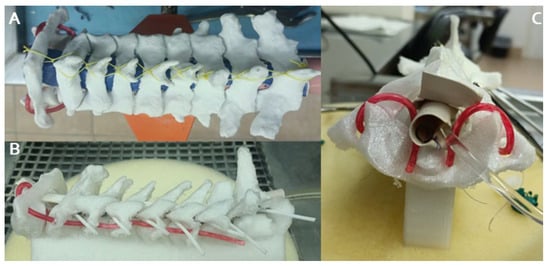 Dorsal (A); lateral (B); and axial proximal (C) views of the final 3D model with all cost-effective components include inside of the spinal canal: Silicon spinal cord, silicon dura mater, ligaments, vertebral arteries, roots through the conjunction foramen and irrigation water system in the cephalic border.