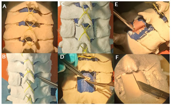 Sequence of steps at the beginning of the simulation of the surgery, from exposure and laminectomy (A–C); opening and removal of the yellow ligament (D–F); and dural opening with linear incision in the midline.