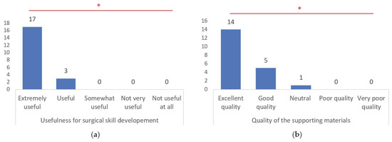 Usefulness for surgical skill development (a); and quality of the supporting materials (b). *, statistically significant differences recognized by chi-square test (p < 0.001).