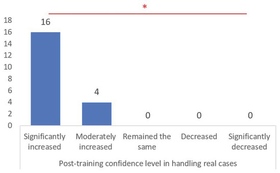 The graph shows participant ratings of experience in post-training confidence level in handling real cases. *, statistically significant differences recognized by chi-square test (p < 0.001).