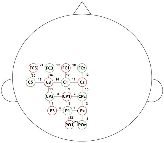 Changes in oxygenated cerebral hemoglobin concentrations (Δ[HbO]) during the AMEDA test were examined using an fNIRS instrument (NIRSport2, NIRx Medical Technologies LLC, Glen Head, NY, USA). The NIRS probe consisted of 8 sources and 7 detectors placed over the left precentral gyrus to the superior parietal area, between FCZ and POZ (based on the international EEG 10–20 system). The probe was divided into three regions of interest (ROI): ROI 1 represented the primary motor cortex (M1), with channels 11, 12, and 14–21; ROI 2 represented the primary sensory cortex (S1), with channels 7–11 and 13–14; and ROI 3 represented the posterior parietal cortex (PPC), with channels 1–8 and 22–23 (Figure 1). The inter-optode distance was set at 45 mm using a transparent plastic spacer, and a black elastic headband was worn over the probe to secure placement and minimize the effects of ambient light. The fNIRS signals were first converted into optical density and then processed with a high-pass filter at 0.01 Hz to remove baseline drift and low-frequency oscillations and a low-pass filter at 0.2 Hz to reduce the effects of cardiovascular artifacts and high-frequency noise. Δ[HbO] for each knee flexion during the AMEDA test was averaged to represent changes in brain activation. Raw light intensity was converted into changes in hemoglobin concentration using the modified Beer–Lambert law.
