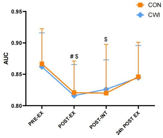 Changes in knee proprioception for control (CON) and cold-water immersion (CWI) conditions. AUC, the area under the receiver operating characteristic curve of the knee Active Movement Extent Discrimination Assessment test. PRE-EX, pre-exercise; POST-EX, post-exercise; POST-INT, post-intervention; 24 h POST EX, 24 h post-exercise. # significantly different compared with pre-exercise in CWI. $ significantly different compared with pre-exercise in CON. The values are shown as mean ± SD. p < 0.05 was considered statistically significant.