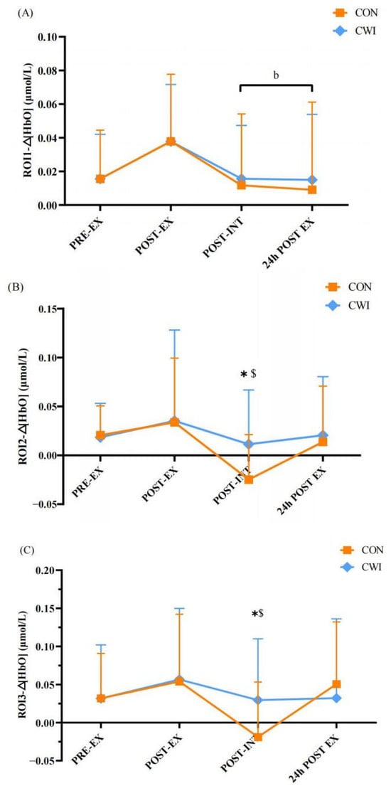 Changes in the primary motor cortex (ROI1, (A)), the primary sensory cortex (ROI2, (B)), and the posterior parietal cortex (ROI3, (C)) for control (CON) and cold-water immersion (CWI) conditions. PRE-EX, before exercise; POST-EX, after exercise; POST-INT, after intervention; 24 h POST EX, 24 h after exercise. * significantly different compared to CON. b significantly different compared to post-exercise in CON. $ significantly different compared to pre-exercise in CON. The values are shown as mean ± SD. p < 0.05 was considered statistically significant.