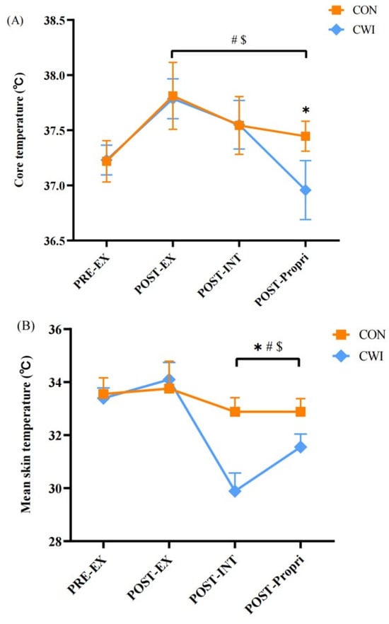 Change in core temperature (A) and mean skin temperature (B) for control (CON) and cold-water immersion (CWI) conditions. PRE-EX, before exercise; POST-EX, after exercise; POST-INT, after intervention; POST-Propri, the proprioception test after intervention; 0–10, during the intervention time. * significantly different compared to CON. # significantly different compared to pre-exercise in CWI. $ significantly different compared to pre-exercise in CON. The values are shown as mean ± SD. p < 0.05 was considered statistically significant.