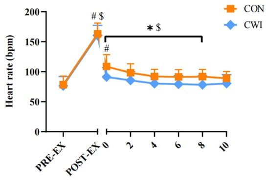 Change in heart rate for control (CON) and cold-water immersion (CWI) conditions. PRE-EX, before exercise; POST-EX, after exercise; POST-INT, after intervention; POST-Propri, the proprioception test after intervention; 0–10, during the intervention time. * significantly different compared to CON. # significantly different compared to pre-exercise in CWI. $ significantly different compared to pre-exercise in CON. The values are shown as mean ± SD. p < 0.05 was considered statistically significant.