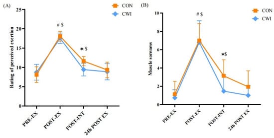Change in rating of perceived exertion (A) and muscle soreness (B) for control (CON) and cold-water immersion (CWI) conditions. PRE-EX, before exercise; POST-EX, after exercise; POST-INT, after intervention; 24 h POST EX, 24 h after exercise; 0–10, during the intervention time. * significantly different compared to CON. # significantly different compared to pre-exercise in CWI. $ significantly different compared to pre-exercise in CON. The values are shown as mean ± SD. p < 0.05 was considered statistically significant.