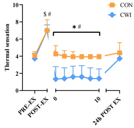 Change in thermal sensation for control (CON) and cold-water immersion (CWI) conditions. PRE-EX, before exercise; POST-EX, after exercise; POST-INT, after intervention; 24 h POST EX, 24 h after exercise; 0–10, during the intervention time. * significantly different compared to CON. # significantly different compared to pre-exercise in CWI. $ significantly different compared to pre-exercise in CON. The values are shown as mean ± SD. p < 0.05 was considered statistically significant.