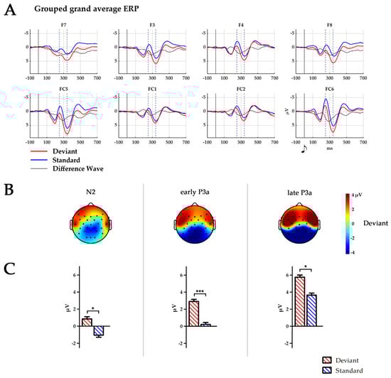 Deviant, i.e., unexpected, novel or rule-breaking stimuli, elicit an enhanced frontal N2–P3a complex in adults. The N2–P3a complex is a sequence of event-related potentials (ERPs) occurring approximately between 150 and 400 ms [59,60]. The enhancement of the N2–P3a complex for rare deviant, in comparison to standard stimuli, reflects (1) automatic and pre-attentive neuronal processes elicited by an unexpected change (N2) and (2) the subsequent unintentional shift of attention towards the deviant and the orientation response (P3a) [60,61,62].