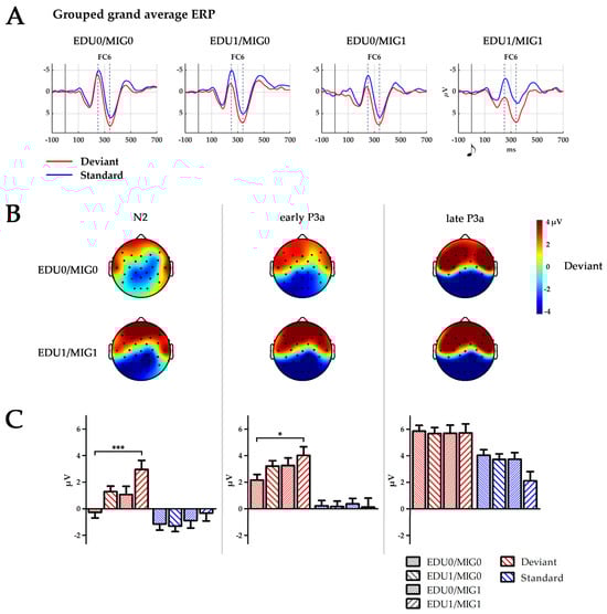 (A) Temporal ERP courses for electrode FC6 for standards left, and deviants right, separated by subject factor groups (EDU0/MIG0, EDU1/MIG0, EDU0/MIG1 and EDU1/MIG1; EDU = education level, MIG = migration background; 0 low risk, 1 high risk). Time points 0 ms indicate the presentation of the respective tone. Dashed lines indicate peaks of N2 at 250 ms and P3a at 340 ms. (B) Topography of the deviant stimulus in the time windows of N2: 224–274 ms, early P3a: 264–314 ms and late P3a: 314–364 ms for groups EDU0/MIG0 and EDU1/MIG1. Black dots depict electrode placement. (C) Boxplot depicting mean amplitude of standard and deviant processing over all six electrodes (F7, F8, F3, F4, FC5, and FC6) for the time window N2, early P3a and late P3a separated for all four subject factor groups (EDU0/MIG0, EDU1/MIG0, EDU0/MIG1 and EDU1/MIG1; EDU = education level, MIG = migration background; 0 = low risk, 1 = high risk). * p < 0.05; *** p ≤ 0.001.