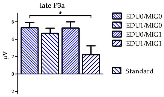 Boxplot depicting mean amplitude of standard processing over electrode FC6 for the time window late P3a separated for all four subject factor groups (EDU0/MIG0, EDU1/MIG0, EDU0/MIG1 and EDU1/MIG1; EDU = education level, MIG = migration background; 0 = low risk, 1 = high risk). * p < 0.05.