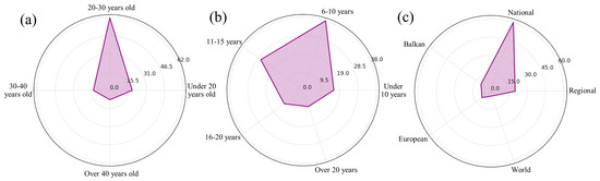 Regarding the competitions in which they obtained notable results, approximately 58% of the athletes triumphed in national competitions, demonstrating a high level of success and competence on the domestic stage. Regional and Balkan champions are less common, with 19% and 10% of the total, respectively, indicating that although a significant number of athletes achieve victories at the national level, fewer manage to advance to larger competitions. At the same time, participation and success in European and world competitions are even rarer, with only about 9% and 4%, respectively (Figure 1c). It highlights the exceptional performances of a select group of athletes who distinguish themselves on the international stage.