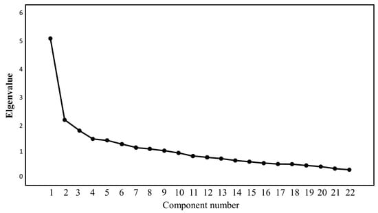 In order to find the factorial structure of the survey, varimax rotation was the method of choice. Table 1 shows that the model obtained from the 22 items explains 46.7% of the variance. This indicates that the factors identified through the analysis explain nearly half of the variability observed in the participants’ responses. In other words, 46.7% of the differences in the responses can be attributed to the factors included in the model, suggesting a significant but not complete explanation of the data’s variability. As seen from Figure 2, factor 1 is the most important by visual inspection to be taken into consideration, followed by the other five factors (with their own value bigger than 1), which justifies keeping them in the model.