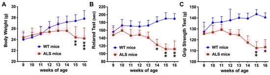 Progression of motor functional deficits in SOD1-G93A mice from 9 to 16 weeks of age. Body weight was measured every week (A). Motor function was assessed weekly in mice using the rotarod test (B) and Grip strength test (C). Data represent mean ± SEM. Statistical analysis was performed using a two-way ANOVA followed by a Bonferroni test (* p < 0.05, ** p < 0.01, and *** p < 0.001 vs. age-matched WT mice, n = 8 each group).