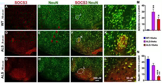 ALS is noteworthy for upper and lower motor neuron death, which eventually leads to muscle weakness and paralysis. The respiratory dysfunction and eventually respiratory failure especially accounts for a large portion of morbidity and mortality in ALS [,]. The brainstem is the structure which modulates breathing, heart function, and more, as well as containing pathways for communication between the brain and the spinal cord. We first used double fluorescent-staining to detect the levels of broad inflammation regulators, SOCS3 and GFAP-positive (GFAP+) astrocytes, in the brainstem of ALS mice. As shown in Figure 2, SOCS3 expression was significantly upregulated in the brainstem of ALS mice, especially in the preBötC of the brainstem (Figure 2D,F,G,I,K,L), compared to WT mice. The preBötC, a portion of the ventrolateral medullary reticular formation is thought to generate the inspiratory breathing rhythm in mammals [,]. In the preBötC, ALS-upregulated SOCS3 (Figure 2D,G,K,L) was associated with increased and reactive GFAP+ astrocytes (Figure 2E,H,K,L,N), indicating that the neuroinflammation already started before the disease onset as early as 9 weeks of age as examined, and kept ongoing after disease onset. However, there was no colocalization of SOCS3 and GFAP+ astrocytes (Figure 2F,I,K,L), which indicates that the resource of increased SOCS3 was not from GFAP+ astrocytes in the areas examined.