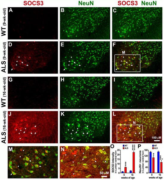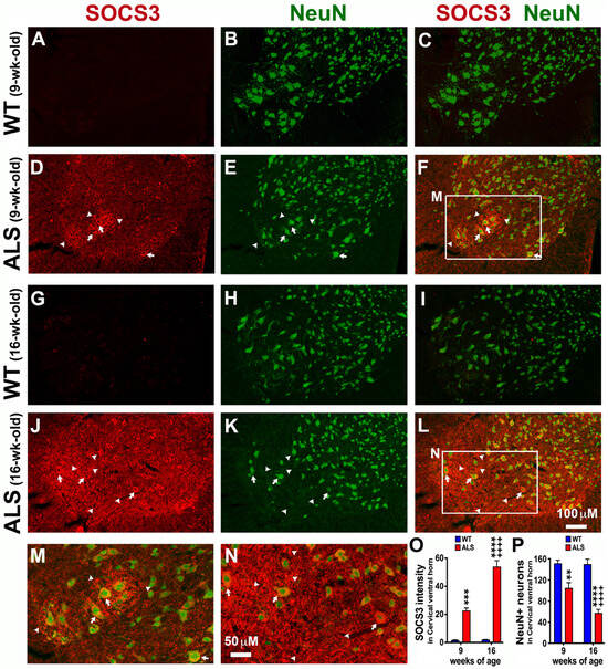 ALS significantly upregulates SOCS3 in the ventral horn of cervical spinal cord where neurons are lost. IHC was used to detect SOCS3 and NeuN+ neurons. Representative confocal im-ages show that SOCS3 levels were significantly upregulated in the ventral horn of the cervical spinal cord in ALS mice at 9 weeks (D,F) and 16 weeks (J,L) of age, as compared to WT mice at 9 weeks (A,C) and 16 weeks (G,I) old, respectively. Panels (M) and (N) are higher magnifications of the boxed areas (the major motor neuron pool in the ventral horn) in panels (F) and (L), respectively. The NeuN+ neurons were significantly decreased in ALS mice (E,K,F,L,P) over disease progression when compared to what found in WT mice (B,H,C,I,P). The ALS-increased SOCS3 was either co-localized with NeuN+ neurons (arrows) or not (arrowheads). Graphs represent mean ± SEM of four animals per group per time-point for SOCS3 intensity (O) and NeuN+ neurons (P). ** p < 0.01, *** p < 0.001, **** p < 0.0001 vs. age-matched WT mice; ++++ p < 0.0001 vs. 9-week-old ALS mice (two-way ANOVA followed by a Bonferroni test).