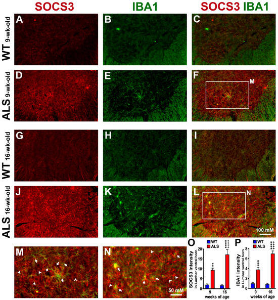 ALS-increased SOCS3 is partially co-localized with increased microglia/macrophages in the ventral horn of the lumbar spinal cord. IHC was used to detect SOCS3 and Iba1+ microglia/macrophages. Representative confocal images showed that SOCS3 was significantly increased in the ventral horn of the lumbar spinal cord collected from ALS mice at both 9 weeks (D,F) and 16 weeks (J,L) of age when compared to the age-matched WT mice at 9 weeks (A,C) and 16 weeks (G,I) old, respectively. In addition, Iba1+ microglia/macrophages were significantly increased in ALS mice (E,K,F,L,P) when compared to what found in WT mice (B,H,C,I,P). Panels (M) and (N) are higher magnifications of the boxed areas (the major motor neuron pool in the ventral horn) in panels (F) and (L), respectively. The ALS-increased SOCS3 was either co-localized with Iba1+ microglia/macrophages (arrows) or not (arrowheads). Graphs represent mean ± SEM of four animals per group per time-point for SOCS3 intensity (O) and Iba1+ neurons (P). ** p < 0.01, *** p < 0.001, and **** p < 0.0001 vs. age-matched WT mice; ++++ p < 0.0001 vs. 9-week-old ALS mice (two-way ANOVA followed by a Bonferroni test).